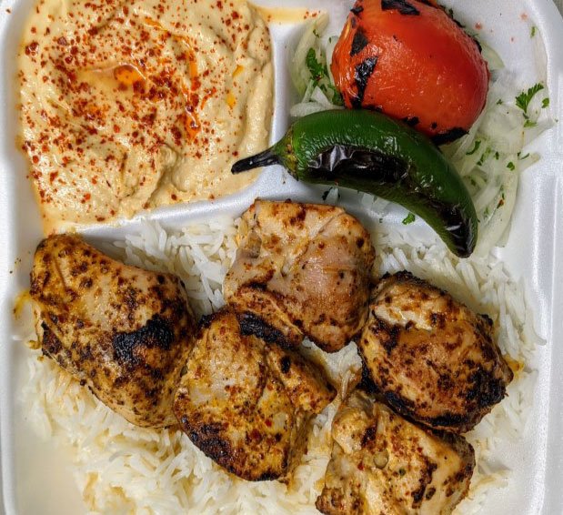 Grilled Chicken Kabob with Tazikidi sauce, Hummus,